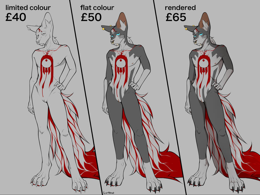 this is a rough overview of what each category contains, for limited colour i usually choose one or a few smaller elements to colour in. rendered can also have atmospheric lighting/complex lighting depending on what is requested